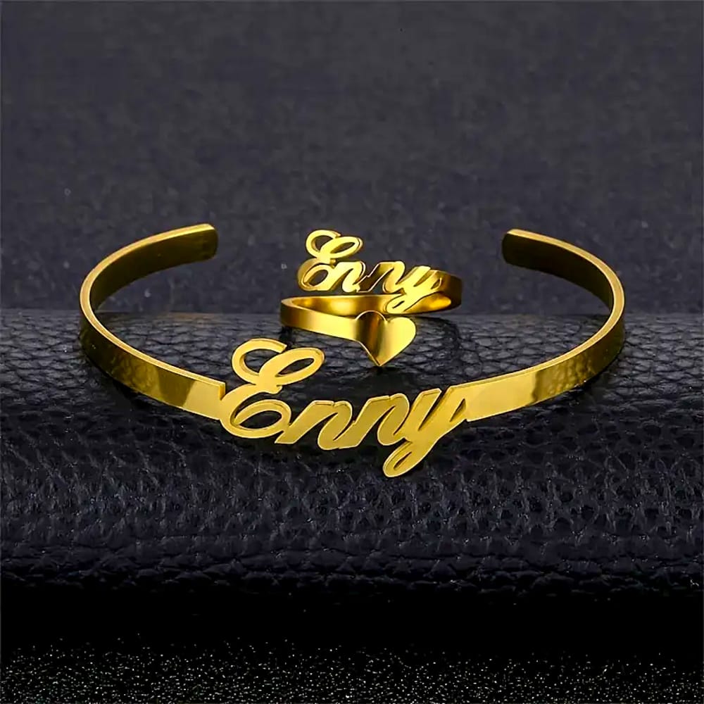 The set’s foundation lies in balance—between strength and suppleness, structure and flow. The bypass ring wraps gracefully around the finger, its open ends meeting without closing, allowing the personalised name to flow seamlessly across the top arc. The open bangle mirrors this language: a gently curved band with a gap designed for comfort and movement, finished with an engraved name that becomes part of the piece’s natural contour. Together, they form a cohesive pair that feels designed, not assembled.